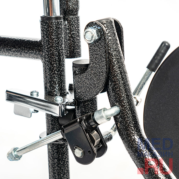 - Поворотные съёмные подножки с независимо позиционируемыми ортопедическими упорами для голени, поднимаются до горизонтального положения.