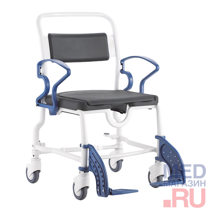 Стул полностью разборный, поэтому его удобно хранить и перевозить. Передвигать стул по комнате помогают 4 колеса на каждой ножке. На задней паре предусмотрены тормоза, которые не только останавливает устройство, но и фиксируют его в заданном положении. Все элементы изделия легко моются и дезинфицируются.