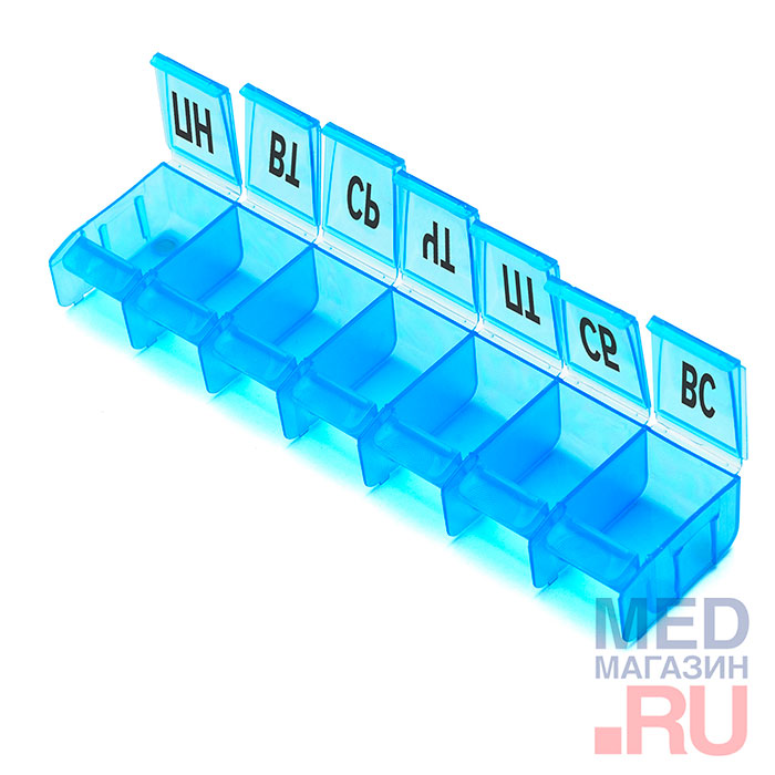- 7 отделений на неделю. Каждое отделение соответствует дню недели (с понедельника по воскресенье) — сразу видно, какие таблетки нужно принять сегодня.